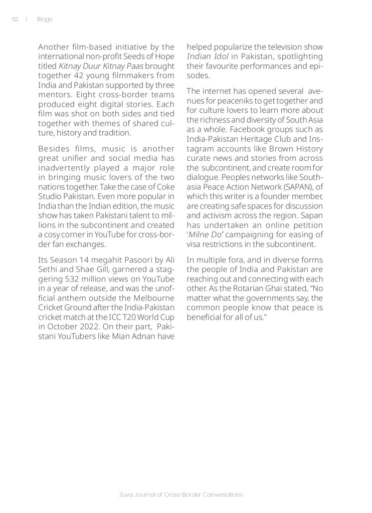 In multiple fora, and in diverse forms, the people of India and Pakistan are reaching out and connecting with each other. As the Rotarian Ghai stated, “No matter what the governments say, the common people know that peace is beneficial for all of us.”