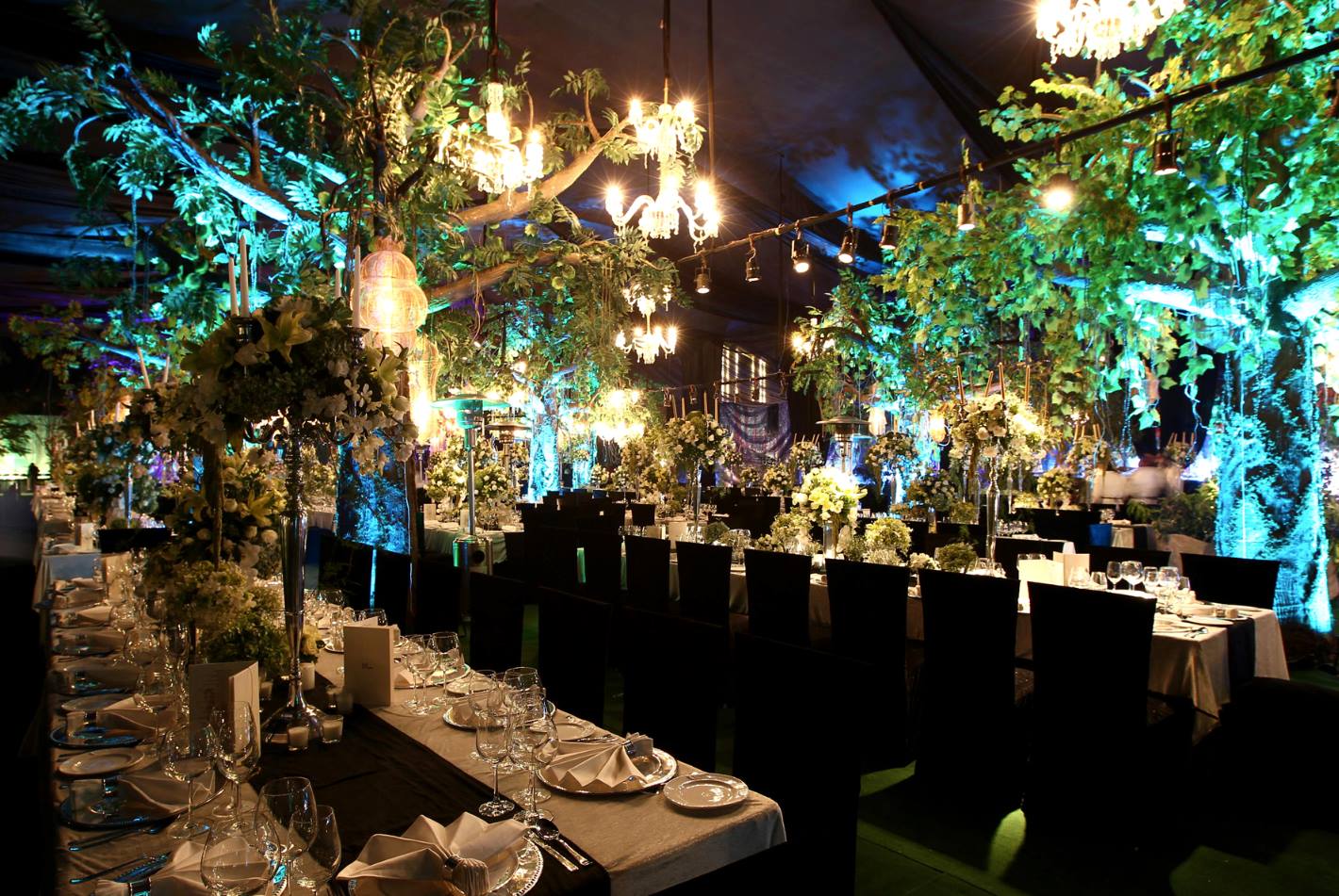 He cites the example of a recent wedding when they created two forests within one venue. “The entrance was a white forest awash in pristine snow, and the dining area was a tropical forest, so guests could experience two different worlds in the same evening,” he says. There were no natural trees in the area, so he hired artists from Kolkata to create 600 trees that “looked so real you couldn’t tell the difference”. The banquet area seated 1,000 people under a canopy of woodland and chandeliers.