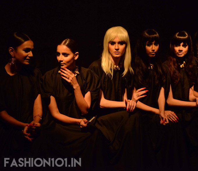 It is a row of models facing us, six on both sides. They have on precision makeup, red nails, coiffed hair. They appear to be wearing Eina Ahluwalia jewellery, a glint of gold hits your eyes but you cannot pay attention because – oh, my – they are all looking at you rather judgementally. They whisper to one another, their eyes fixed on your clothes, your shoes, checking out what you’re wearing. Suddenly, roles are reversed. The viewer becomes the viewed. The observer becomes the subject. You hold your breath and want to rush past; high-school bullies and peer pressure rear their ugly heads in your heart. One of my companions avoids them altogether and sneaks past behind them instead.
